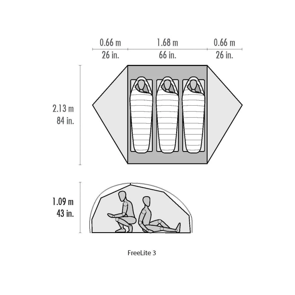 In deze FreeLite 3 heb je voldoende ruimte om met 3-personen te slapen mits je allemaal een Exped M of een Therm a Rest R slaapmat gebruikt. Je kan er ook voor kiezen om deze tent met 2-personen te gebruiken. Je hebt dan een zee van slaapruimte en ook nog extra om je bagage ook daadwerkelijk in de binnentent te stallen.Â